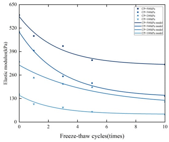 The elastic modulus curves under freeze–thaw cycles at various confining pressures are shown in Figure 5. Confining pressure significantly affects the changes in the elastic modulus of solidified soil. As the number of freeze–thaw cycles increases, the elastic modulus of the solidified soil deteriorates at varying rates. Consequently, Equation (1) can be used to describe the relationship between the elastic modulus Er and the number of freeze–thaw cycles.