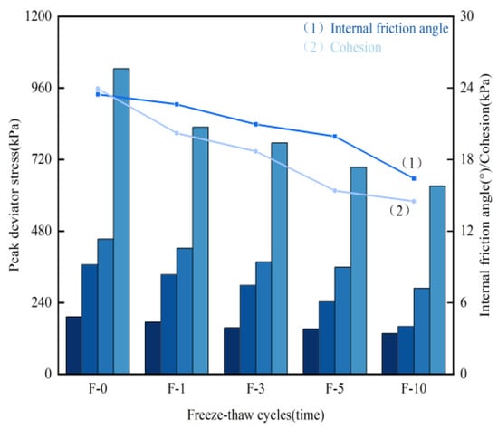 - With more freeze–thaw cycles, the peak deviatoric stress of the soil sample diminished and the range of cohesion significantly decreased, while the internal friction angle remained relatively stable.