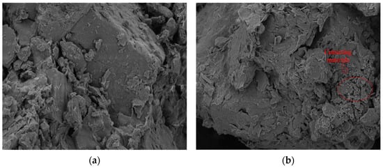 As illustrated in Figure 9, the uncured sample (Figure 9a) shows fewer connections between soil particles, with no visible cracks or pores on the surface, resulting in a relatively dense microstructure. In contrast, the sample cured with rice husk carbon and calcium lignin sulfonate (Figure 9b) exhibits flocculent polymers adhering to the soil surface around small pores. This outcome reflects the complete reaction of the curing agent, leading to an uneven distribution of hydrates around the pores, thereby preventing the formation of large pores in the soil sample. This finding is consistent with Liu’s observation [45] that lignin and silt undergo protonation reactions and electrostatic attractions, ultimately forming a dense and stable soil structure. However, in this study, the addition of rice husk carbon further enhances the reaction between the lignin and silt.