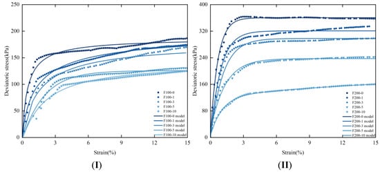 Taking confining pressures of 100 kPa, 200 kPa, 300 kPa, and 500 kPa as examples, the experimental data are presented in Figure 6. By substituting the data from Table 5 and Equation (2) into Equation (1), the calculated values are obtained and depicted in the fitting curve in Figure 6. The comparison demonstrates a strong correlation, with experimental values closely matching the calculated ones, achieving a correlation coefficient greater than 0.88. Thus, it is evident that the predictive equations in Equations (1) and (2) effectively describe the relationship between the elastic modulus of solidified silt, the number of freeze–thaw cycles, and the confining pressure.