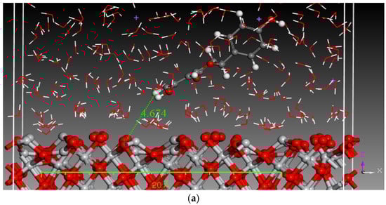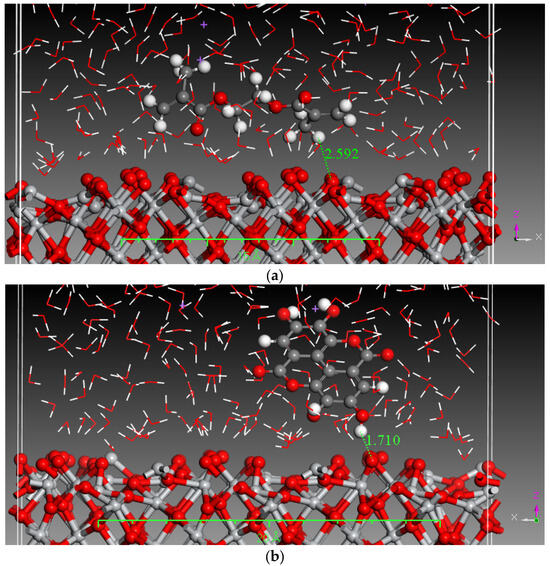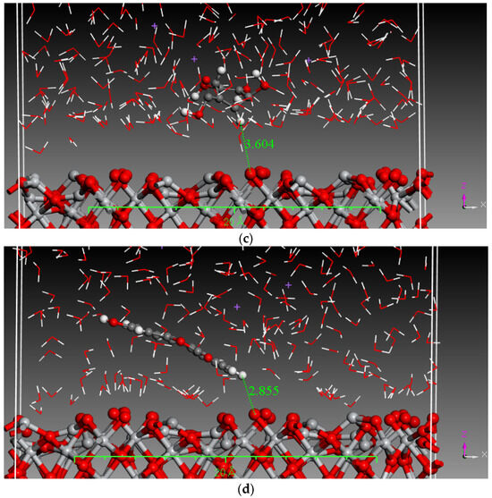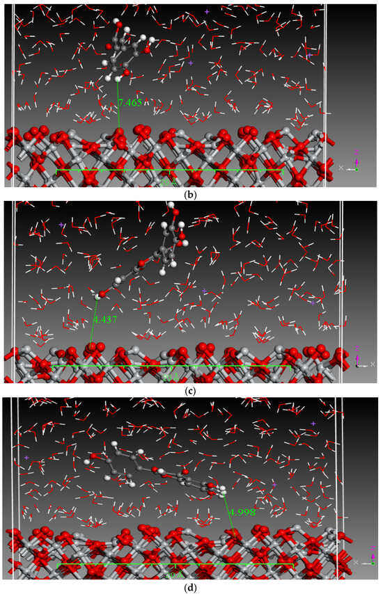 Monte Carlo (MC) and MD simulations were conducted to investigate the inhibition phenomenon on metal surfaces and to identify low-energy adsorption sites for the various compounds present in the inhibitors. These techniques have gained popularity for providing insights into the preferential adsorption of molecules on metal surfaces [21]. Figure 1 and Figure 2 present simulations of the adsorption orientation of different molecules on a titanium oxide (TiO2) surface. The results show that molecules exhibit a non-flat adsorption orientation on the TiO2 surface. After optimization, the estimated adsorption energies of different molecules on the TiO2 (001) surface and the corresponding adsorption geometries are listed in Table 2.