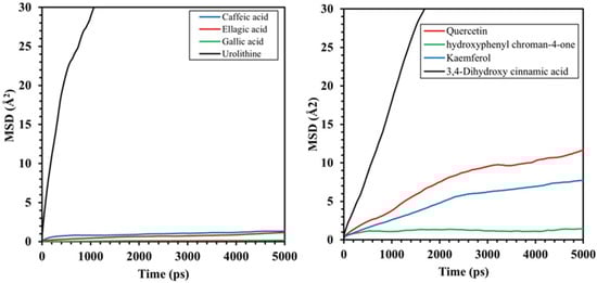 MD simulation of the constituent components of pomegranate peel extract in a 3.5% NaCl solution (a). Caffeic acid (b) Ellagic acid (c) Gallic acid and (d) Urolithine.
