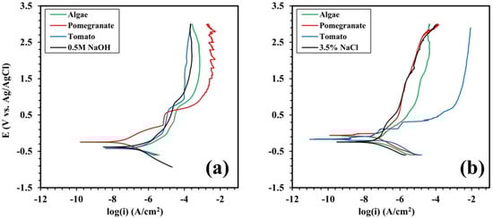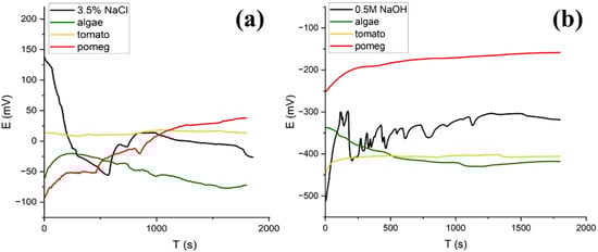 The OCP measurements were conducted to evaluate the thermodynamic stabilities of the grade 2 Ti samples in two environments: with and without inhibitors. Figure 4 shows the OCP measurements of grade 2 Ti samples in 3.5% NaCl (Figure 4a) and 0.5 M NaOH (Figure 4b) solutions with different natural inhibitors. In these figures it can be observed that the OCP values of the Ti samples in both solutions take about 1000 s to reach an indicative steady state. As shown in Figure 4a, by adding pomegranate to a 3.5% NaCl solution, the OCP of the Ti samples is shifted to the higher values. Conversely, the presence of algae in a sodium chloride solution led to a decrease in the OCP value of the Ti. In a 0.5 M NaOH solution, only pomegranate extract increases the OCP value of the Ti sample, from −319 mV to −158 mV. Both the tomato and algae decreased the OCP to −417 mV and −425 mV, respectively.