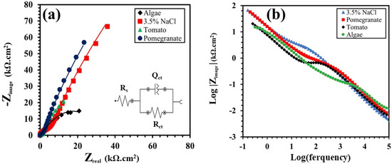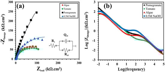 Figure 5a displays the equivalent electrical circuit employed to fit the experimental data obtained by the EIS test. The circuit includes a solution resistance (Rs) in series with a parallel capacitive loop charge transfer resistance and constant phase element (CPE) of the oxide layer formed on the surface (Rct/Qct). The CPE is inserted into the circuit to serve as an alternative to the capacitor, aiming for a closer fitting under conditions where the frequency exponent is below 1.0 [46,47,48,49,50]. According to Figure 5a, the impedance at lower frequencies serves as an indicative measure of both the polarization resistance and the corrosion resistance. Therefore, the corrosion resistance values of the specimens are in the following order: pomegranate > 0.5 NaOH (reference) > tomato > algae. The charge transfer resistance (Rct) of the oxide layer is inversely proportional to the corrosion rate. According to Table 3, the Rct value of the Ti sample in a 0.5 M NaOH solution without any inhibitors is 2.82 × 105 Ω.cm−2. By adding the pomegranate extract as an inhibitor, the Rct value was increased to 2.01 × 106 Ω.cm−2. In other cases, it was observed that tomato extract and algae have a negative effect on the corrosion resistance of Ti samples in a NaOH solution, so that the Rct values decreased to 1.52 × 105 and 1.56 × 105 Ω.cm−2, respectively.