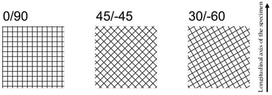 This research analyses the fracture behaviour and the notch effect observed in additively manufactured (FFF) ASA specimens containing U-notches. With this aim, an experimental programme composed of 72 fracture tests (SENB specimens) and 9 tensile tests was designed. The fracture specimens covered four different nominal notch radii (0 mm, 0.50 mm, 1 mm and 2 mm) and three different raster orientations (0/90, 45/−45 and 30/−60), with six specimens per combination of notch radius and raster orientation to facilitate capturing the inherent scatter of the fracture results. In the case of the tensile tests, three specimens were tested per combination, as the scatter associated with tensile results is less pronounced than in fracture tests. All specimens (fracture and tensile) were printed in the flat position, with a schematic of the raster orientations shown in Figure 1.