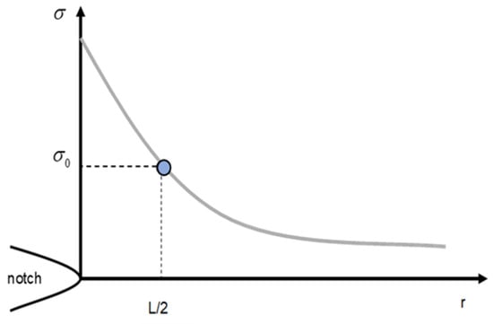 The methodologies comprising the TDC are based on the stress field generated at the defect tip being analysed [38], with two of them, the Point Method (PM) and the Line Method (LM), presenting a better balance between complexity and accuracy in the predictions. The PM is the simplest approach and assumes that fracture takes place when the stress reaches inherent stress, at a distance of rc from the defect tip equal to L/2 [38]. The failure criterion is as follows (see Figure 3):