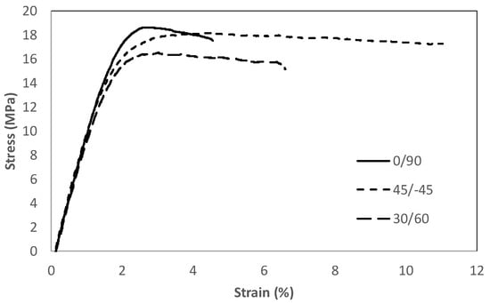 The main tensile properties derived from the tensile tests are shown in Table 1, with Figure 4 showing some of the obtained tensile curves. The maximum strength is achieved in raster orientation 0/90, with the minimum being observed in orientation 30/−60. For the three raster orientations, the tensile strength (the maximum tensile stress sustained by the specimen during the test) is located at yield, which, as defined per ASTM D638 [48], corresponds to the first point on the stress–strain curve at which an increase in strain occurs without an increase in stress. Additionally, before achieving the tensile strength, the three materials lose their linear-elastic behaviour and, after yield, they develop different extents of non-linear (plastic) decreasing stress–strain behaviour up to the final break. In any case, the strength results are consistent with those reported in the literature, but clearly located in the lower bound (see Section 1 above). This, however, is not an issue here, as the objective of this research is to analyse the notch effect, and not the maximisation of tensile strength through the optimisation of printing parameters and/or the application of material post-treatments. Raster orientation 0/90, moreover, provides the lower ductility.