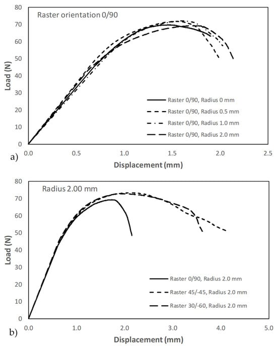 where υ is the Poisson’s ratio and E is the Young’s modulus. Figure 5 shows examples of the obtained load–displacement curves, while Table 2, Table 3 and Table 4 gather the individual results of the different tests (with the corresponding measured geometrical parameters, beyond the nominal ones). In Figure 5a, it can be observed how the notch effect is very moderate for a given raster orientation, with very similar curves for the different notch radii and with the area below the curve up to the maximum load (directly related to the fracture toughness) being slightly larger when the notch radius increases. Analogously, Figure 5b shows that, for a given notch radius, the area below the curve up to the maximum load (and then the toughness) is lower for raster orientation 0/90 and higher for raster orientation 45/−45.