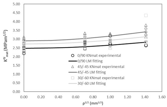 Figure 6 represents the evolution of the apparent fracture toughness experimental results (gathered in Table 2) with the notch radius (i.e., notch effect), together with the LM fitting (Equation (6)), with L being the fitting parameter and following the least squares approach. In addition, Kmat is fixed as the average value obtained in cracked conditions. In other words, the points in Figure 6 represent the individual KNmat experimental results for the three raster orientations, whereas the lines are the corresponding best-fitting curve of Equation (6) for each orientation. The results show that raster orientation 45/−45 provides the highest values of apparent fracture toughness for the range of notch radii analysed here, including the fracture toughness itself (obtained in cracked specimens). Raster orientation 0/90 provides the lowest values, with 30/−60 providing intermediate results. This is in agreement with previous results obtained by the authors in 3D printed ABS [11] and graphene reinforced PLA (PLA-Gr) [10], but is opposite to those observed in 3D-printed PLA [10]. The results found in the literature (e.g., [51,52,53,54]) also show this trend, with raster orientation 45/−45 providing higher fracture resistance values, even for 3D-printed PLA [54], so the particular results obtained in [10] are an anomaly which would require further analysis for a better understanding. Additionally, the values of apparent fracture toughness observed in ASA (including the fracture toughness obtained in cracked conditions) are significantly lower than those observed in the other materials.