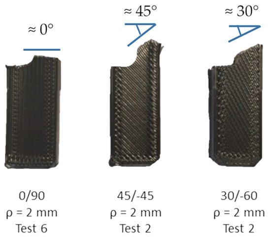 The aspect of the fractographies in raster orientations 45/−45 and 30/−60 is very similar (see examples in Figure 10, with the crack fronts, again, located in the lower part of the image), although the defect propagation planes are not perpendicular to the longitudinal direction of the specimens (i.e., perpendicular to the principal bending stresses), but they basically propagate along one of the printing orientations (45° or −45° for raster orientation 45/−45; 30° or −60° for raster orientation 30/−60) and are perpendicular to the other one (−45° or 45° for raster orientation 45/−45; −60° or 30° for raster orientation 30/−60), as shown in Figure 11. These larger and less efficiently oriented propagation planes may contribute to the higher fracture resistance observed in these two raster orientations (see Figure 6).