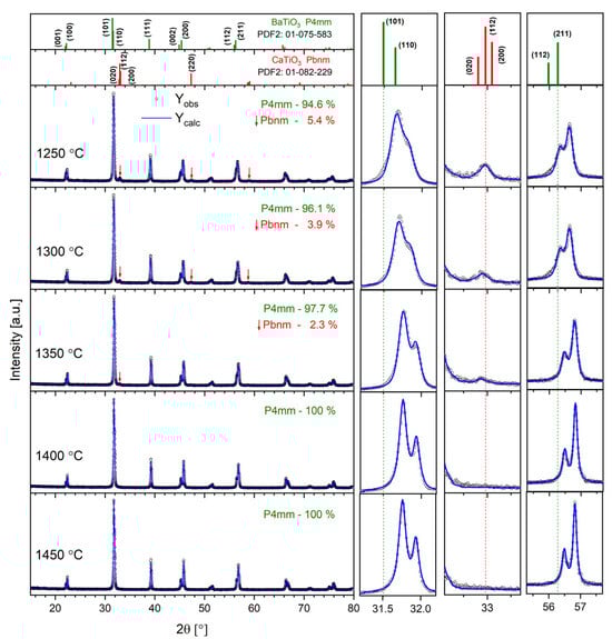 Ceramics sintered at TS = 1400 °C and TS = 1450 °C are single-phase, while a small amount of orthorhombic-phase ceramics (Pbnm space group), characteristic of CaTiO3 perovskite, was detected for the other samples. The top panel of Figure 1 shows standard XRD patterns for the tetragonal BaTiO3 and orthorhombic CaTiO3 as a reference. Thus, it can be assumed that only the highest temperatures, T = 1400 °C and T = 1450 °C, are sufficient to dissolve all the Ca2+ ions in the BTO lattice. On the other hand, a synthesis temperature of up to T = 1350 °C provides too little energy, and the Ca-rich orthorhombic phase is separated. Moreover, the contribution of the Pbnm phase gradually decreases with the growth of the sintering temperature, confirming the above findings. In turn, the volume of the Pbnm unit cell significantly increases with the rise in synthesis temperature, proving that some amount of Ba2+ ions replace Ca2+ ions in the orthorhombic Pbnm structure. To obtain the structural parameters, the Rietveld refinement method was applied. The results are displayed in Table 1. One can note the gradual decrease in lattice parameters with the increase in annealing temperature for the P4mm majority phase. This is mostly because more Ca2+ ions are located inside the BTO structure when the annealing temperature increases. The latter can be evidenced by the gradual shifting of diffraction peaks towards the higher 2θ angle visible in the right panel of Figure 1. For ceramics sintered at TS = 1400 °C and TS = 1450 °C, the lattice parameters are almost identical, as all the Ca has been dissolved in the BTO lattice. It is clearly visible in the right panel of Figure 1 that the width of the diffraction peaks gradually decreases with the increase in annealing temperature. This results from the lower level of lattice strains and imperfections caused by the elevated temperature.