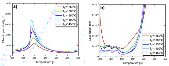 The effect of the temperature changes on the loss factor is shown in Figure 3b. In the case of materials sintered at temperatures of T = 1250 °C, T = 1300 °C and T = 1350 °C, only slight changes in the values of the loss tangent (tan δ) are noted in the temperature range of 325 K–400 K. A distinct loss peak, observed at the Curie temperature and indicating a phase transition, only appears for ceramics sintered at the two highest temperatures. All the presented characteristics exhibit a strong increase in losses above 450 K, which may be attributed to the increased mobility of charge carriers arising from defects or vacancies in the sample [,]. The value of the loss tangent at room temperature significantly decreases with the increase in sintering temperature (Table 3), which is extremely important from an application standpoint.