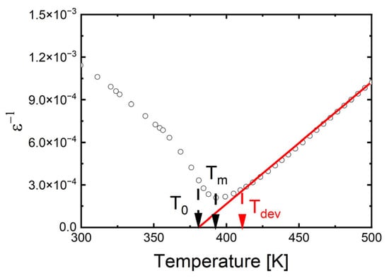 Additionally, the maxima of dielectric permittivity observed in Figure 3 exhibit broadening, which appears to be more pronounced at lower sintering temperatures. To fully assess this phase transition broadening, an attempt was made to fit both the classical and modified Curie–Weiss laws to the experimental data. Since the 1/ε(T) dependence does not immediately become linear above the TC temperature, the classical Curie–Weiss law is only applied above the Tdev temperature. In the temperature range between TC and Tdev, the modified Curie–Weiss law is used (1):