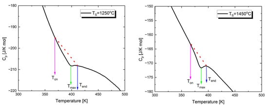 As mentioned above, the temperature characteristics of dielectric permittivity show a peak associated with the transition from the low-temperature ferroelectric phase to the paraelectric phase. To investigate the effect of sintering temperature on the thermal parameters of this transition, the temperature dependence of specific heat was determined through calorimetric measurements. Figure 5 shows examples of the temperature dependencies of the specific heat capacity (Cp) for Ba0.75Ca0.25TiO3 sintered at two extreme values of TS. The investigations were carried out during heating cycles.