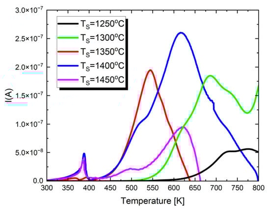 The temperature dependencies of pyroelectric currents and thermally stimulated depolarization (TSD) currents were measured using a computerized system with a Keithley 6485 picoammeter (Cleveland, OH, USA). Before the measurement, the samples were polarized in a DC field at T = 150 °C for 20 min and then cooled to room temperature in this field. The samples were then heated at a rate of 5 K/min up to 773 K, and the current was measured as a function of temperature and time.