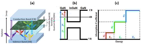 Recently, an experiment demonstrated that materials utilized in IBSCs include (In, Ga) self-assembly in the GaAs matrix, InAs QDs in the GaAs matrix, and GaSb QDs in the GaAs matrix, showcasing promising PCEs of up to 18% []. Moreover, nanostructures, particularly quantum wells, play a pivotal role in enhancing the performances of photovoltaic cells. Rooted in III-N semiconductors, these nanostructures offer distinct advantages over conventional semiconductors, such as heightened energy efficiency and durability. In addition, the InGaN ternary alloy demonstrates the remarkable ability to absorb the entire visible spectrum, spanning from infrared (IR) to ultraviolet (UV) wavelengths, contingent upon variations in indium concentration. Nonetheless, achieving comprehensive spectral absorption poses challenges during growth, primarily attributable to these materials’ localized and polar nature, particularly when indium concentrations exceed 50% [].