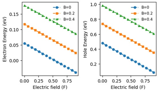 Figure 3 illustrates the changes in electron (Panel (left) and hole energies (Panel (right)) concerning variations in the electric field, considering three different magnetic field intensities. A notable observation emerges: electron and hole energies exhibit a linear decrease with increasing electric field intensity, regardless of the magnetic field strength. Specifically, for B = 0.4 T, the electron energy reduces from 0.177 eV to 0.098 eV, respectively, and the hole energy reduces from 0.983 eV to 0.648 eV, respectively, as the electric field intensity (F) rises from 0 to 0.8. This signifies decreases of 180.61% and 151.70% for the electron and hole energies, respectively, resulting in an energy shift towards the red spectrum. In addition, this red shift occurs due to the weakening Coulomb interaction between the electron and a donor impurity at the well’s center as the electric field strengthens. Moreover, electron and heavy hole energies increase with rising magnetic field intensity at a constant electric field intensity. For instance, at F = 0.4, the electron energy () shifts from 0.0145 eV to 0.1365 eV as B increases from 0 to 0.4, marking a 941.38% increase.