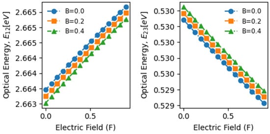 Figure 4 displays the optical transition energies plotted against the electric field (F) for three magnetic field values. Expectedly, , representing the bandgap of GaN, remains unaffected by these variations. Since and are strongly influenced by electric and magnetic fields, it is logical to anticipate a similar dependence in optical transition energies. The electric field impacts and , causing decreases in their values. According to our calculations, decreases with an increasing electric field regardless of the magnetic field strength, while exhibits a consistent increase. Specifically, the primary optical transition energy, , rises from 2.6635 eV to 2.6650 eV, indicating a 1.5 meV increase, i.e., nearly a 0.6% rise, resulting in a slight blue shift, indicative of the enhanced absorption of low-energy photons.
