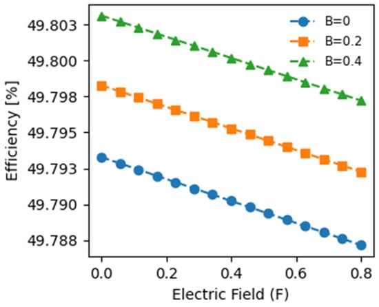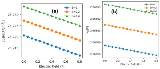 Moreover, with an escalation in the magnetic field strength, () demonstrates a modest linear increase. For example, at an electric field strength of 0.4, () changes slightly from 2.66659 V to 2.66663 V, representing a minor rise of within the analyzed magnetic field range. This phenomenon arises from the accumulation of charge carriers near the junction induced by the heightened magnetic field, leading to a slight augmentation in (). Overall, within the studied ranges of electric and magnetic fields, the variations in () are exceedingly slight, underscoring the importance of the obtained data and highlighting the beneficial impacts of electric and magnetic fields on the open-circuit voltage. Figure 5b demonstrates the variations in the density of the photo-generated current, , influenced by the electric field for three distinct magnetic field strengths. Notably, the highest densities of photo-generated current consistently occur under zero electric field conditions, regardless of the magnetic field intensity. As the electric field strength increases, there is a gradual and linear decline in the photo-generated current density, irrespective of the magnetic field’s magnitude. Two primary factors can explain this phenomenon: firstly, the asymmetrical restructuring of the quantum well under a non-zero electric field (), and secondly, the shifting of electron and hole energy levels away from their optimal positions with increasing electric field, thereby impacting optical transitions. and consequently reduce photon absorption and the number of charge carriers participating in the photo-generated current density. The marginal 0.01% decline in the photo-generated current density is also attributed to applying a relatively weak electric field. The direct correlation between increased magnetic field strength and augmented photo-generated current density is an intriguing observation. For instance, under a fixed electric field condition, such as F = 0.4, the photo-generated current density () increases from 76.216 to as the magnetic field varies from 0 to 0.4, respectively, indicating a 0.2% augmentation. Therefore, this trend can be rationalized by the magnetic field’s substantial influence on the mobility and quantity of charge carriers traversing the junction, thereby enhancing the photocurrent. These results agree well with previous studies [,].
