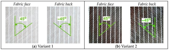 The research materials comprised seven variants of DOS technical fabrics, including two base structures (Variants 1 and 2) and five variants with structural modifications (Variants 3–7). First, an analysis was performed of two variants of biaxial fabrics with a surface mass density of 400 g/m2. These knitted fabrics were made of glass fibers with a linear density of 300 tex (Variant 1) and carbon fibers with a linear density of 506 tex (Variant 2) (Figure 2). Both fabrics were made of two sets of technical yarns arranged at 45° and −45° relative to the wales and interconnected via a pillar stitch.