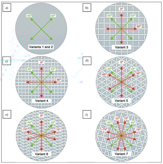To improve the mechanical parameters of the analyzed biaxial DOS structures, the directions were established for sewing on the carbon tape, as a result of which the analyzed glass fabric (Variant 1) underwent structural modification. The structure was built of two layers of glass yarns, arranged +45° and −45° relative to the wales and, thus, 90° from each other (Figure 3a). Such an arrangement of technical yarns in the product provides high strength in the yarn direction, i.e., ±45°. To visualize the changes in the product, the axes along which the threads of the base fabric are arranged are shown in green in the presented figures, while the directions of the added reinforcements are in red.