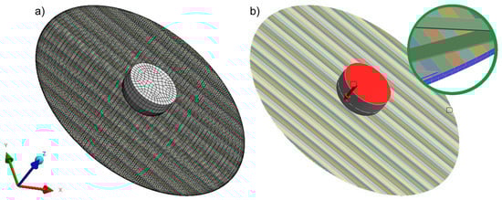 A finite element mesh was applied to the developed geometric models (Figure 4a). The sweep method was used as a division method, enabling a local increase in the mesh density in the contact area between the loading pin and the knitted fabric. A load of 196 N (20 kg) was applied to the upper surface of the loading mandrel (Figure 4b, red), and the entire textile structure was fixed by reducing all the degrees of freedom in the lateral planes around the designed composite reinforcements, i.e., at the edges (Figure 4b, blue). The bottom surface of the textile structure was movable—no degrees of freedom were removed.
