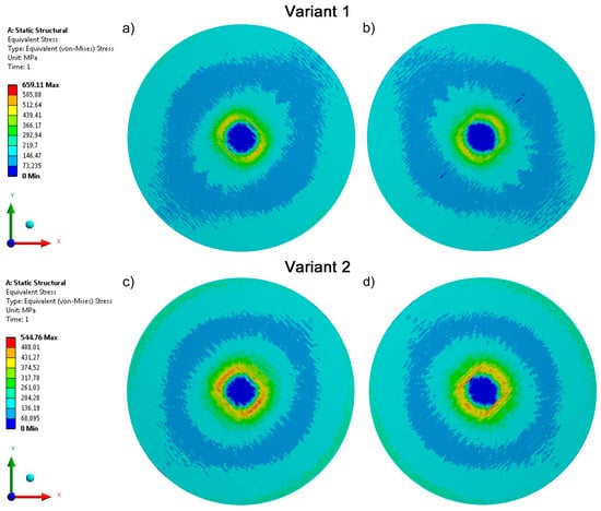 An analysis of the distribution of equivalent stresses occurring in samples Variant 1 and Variant 2 (Figure 5) shows that they are strongly dependent on yarn direction (glass and carbon) in the knitted fabric structures. This characteristic is visible in both layers of the knitted fabrics, i.e., placed at ±45° relative to the wale direction. In addition, the maximum equivalent stresses in the carbon fabric are 17% lower than in the knitted fabric made of glass fibers.