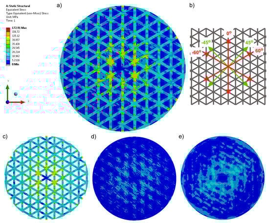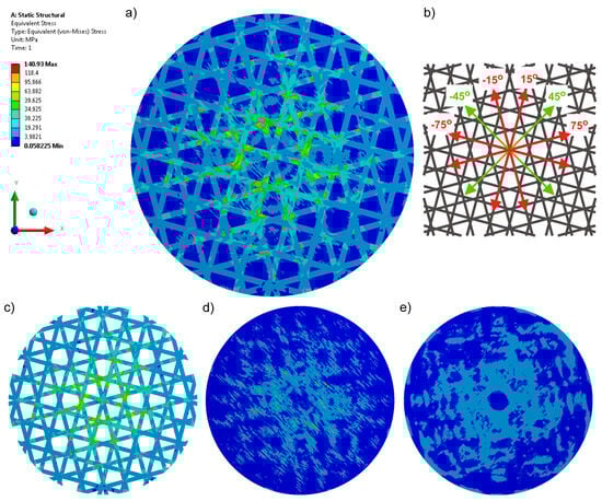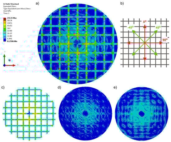 Equivalent stresses recorded for a four-axial knitted fabric (Variant 3): (a) stress in the whole structure, (b) configuration of axes in the product, (c) stress in the reinforcement made of carbon tape, (d) stress in the top layer, and (e) stress in the bottom layer.