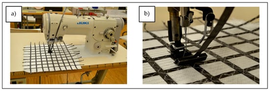 According to the geometrical configurations of the multiaxial directions of stress distribution designed in Section 2.2, a tape made of carbon roving with a width of 6 mm and a linear density of 830 tex was fixed on the surface of a glass fabric (Variant 1). The carbon fiber tape was sewn on with a lockstitch sewing machine, Juki model LZ-2286N (Juki Corporation, Tokyo, Japan), using a three-step stitch (Figure 9). During the sewing process, a special presser foot was used to prevent the material from shirring.