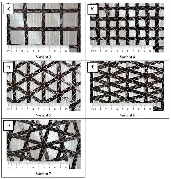 The mechanical parameters of the knitted fabric could be improved by expanding the structure using additional layers of yarns overlapping in the directions of the wales and courses, i.e., at 0° and 90°, giving the textile reinforcement the properties of a four-axial system (Figure 3b). By thickening the additional reinforcement along both the wales and the courses (Figure 3c), these structures can be further modified such that their strength properties are the same or even better compared to knitted fabrics made of a different fiber, e.g., carbon fiber (Variant 2).