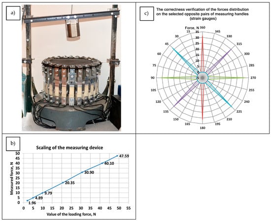 Experimental research on multiaxial force distribution on the surface of technical textiles: (a) measuring instrument; (b) calibration chart; (c) verification graph of the force distribution on opposite pairs of measuring handles.