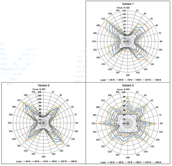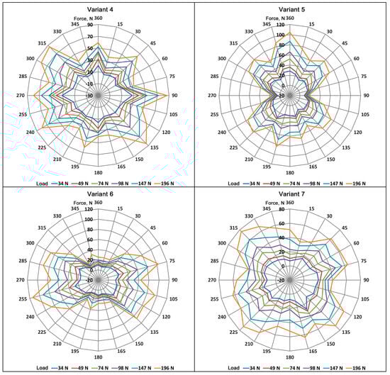 Modifying the knitted structure by increasing the number of axes from two to four, obtained by sewing on the carbon tape at 0° and 90° (Variants 3 and 4), resulted in forces in the directions of the added reinforcement. As a result, the qualitative distribution of forces in the fabric surface became more uniform compared to Variants 1 and 2. This is shown by the forces recorded at the measuring handles placed at 45°, 90°, 135°, 195°, and 225° or 240°, 270°, 300°, −315°, and 360°, which overlap with the axes of the product located at ±45°, 0°, and 90°. Of note, the density of the carbon tape reinforcement sewn onto the knitted fabric decreased the forces occurring in the sample.