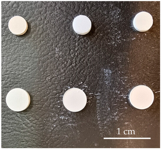 The powders were uniaxially pressed into pellets of 5 mm diameter and 0.2 g weight under 300 MPa and sintered according to the program recommended by the producer in an ambient atmosphere. In case of ScCeSZ and ScYbSZ, the sintering steps were as follows: heating from 20 °C to 300 °C for 4 h, holding at 300 °C for 1 h, heating from 300 °C to 500 °C for 2 h, heating from 1500 °C to 1660 °C for 3 h 15 min, holding at 1660 °C for 1 h, cooling from 1660 °C to 1100 °C for 2 h 30 min, and cooling from 1100 °C to 20 °C for 8 h 20 min. In the case of 20GDC, the sintering steps were as follows: heating from 20 °C to 300 °C for 3 h 20 min, holding at 300 °C for 2 h, heating from 300 °C to 1500 °C for 15 h, holding at 1500 °C for 2 h, and cooling from 1500 °C to 20 °C for 6 h. The noticeable shrinkage of specimens during the sintering process is exhibited in Figure 1.