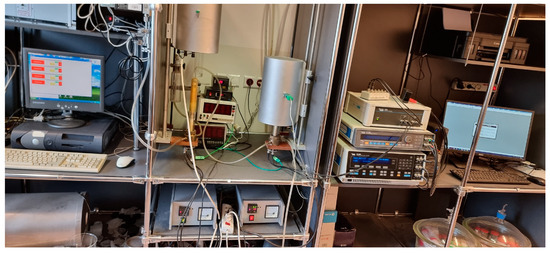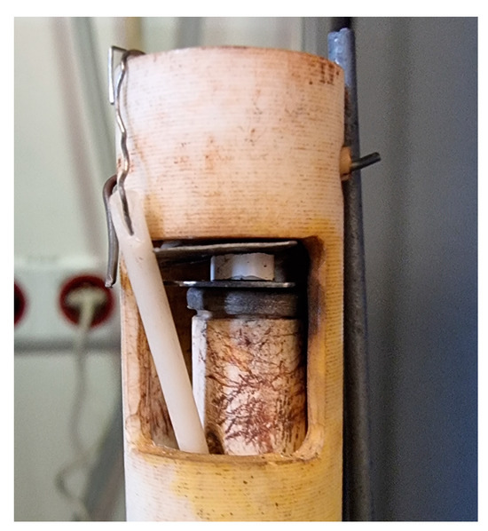 The EIS measurements were performed in controlled atmospheres using a frequency analyzer (Solartron model FRA 1260, Bognor Regis, UK) coupled with a Dielectric Interface (model 1296) in a temperature range of 200–600 °C. The experimental set is presented in Figure 2 and the specimen holder in Figure 3. The frequency range was 0.1 Hz–32 MHz, and the amplitude of the sinusoidal voltage signal was 20 mV. The measurements were performed in the following atmospheres: synthetic air (series no 1, 3, and 5), 3000 ppm NH3 in argon (series no 2), and 10% H2 in argon (series no 4). Series no 3 and 5 in the synthetic air were conducted in order to determine the reversibility of the material impedance response in H2- and NH3-rich atmospheres. The values of the resistances were derived using Zview software (version 2.2, Scribner Associates, Inc., Southern Pines, NC, USA).