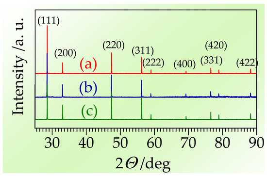 Spectra from XRD are presented in Figure 4. The GDC and ScYbSZ are single-phase and crystalize in the cubic system, while the ScCeSZ specimen is composed mainly of the ZrO2 phase with CeO2 traces. The positions and intensities of the detected peaks are consistent with reference spectra [77,78].