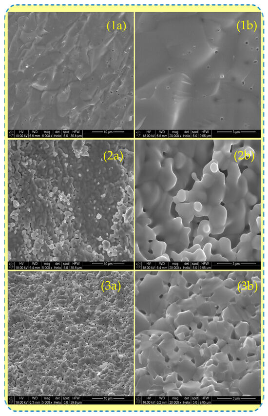 Surface morphology of sintered samples presented on SEM images at different magnifications for (1a,1b) GDC, (2a,2b) ScCeSZ, and (3a,3b) ScYbSZ.