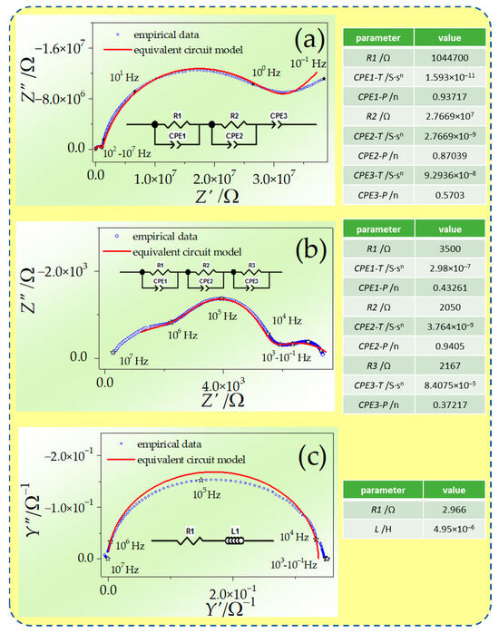 Evolution of EIS spectrum of GDC in H2-containing atmosphere with rising temperature; red line obtained using presented equivalent circuits for parameters values collated in tables at temperatures (a) 200 °C, (b) 500 °C, and (c) 550 °C.