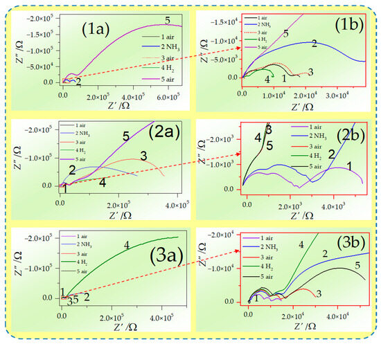 Changes in electrical properties caused by exposition on ammonia- and hydrogen-containing atmospheres presented as Nyquist spectra from EIS at 450 °C for (1) GDC, (2) ScCeSZ, and (3) ScYbSZ; column (b) contains magnified high-frequency bottom-right corner region of spectra from (a) column.