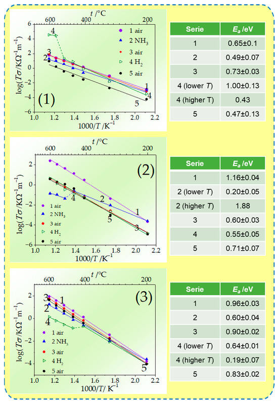 Summary of electrochemical response and reversibility of the probes for exposition on ammonia- and hydrogen-containing atmospheres presented in Arrhenius plots with calculated energy of activation values for (1) GDC, (2) ScCeSZ, and (3) ScYbSZ.