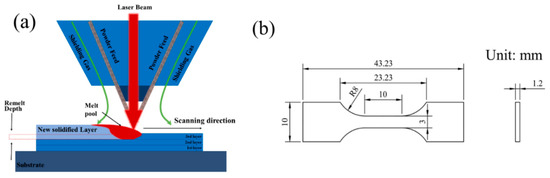 (a) Diagram illustrating the experimental method for the DED-LB. (b) Measurements of the dimensions for the tensile sample.
