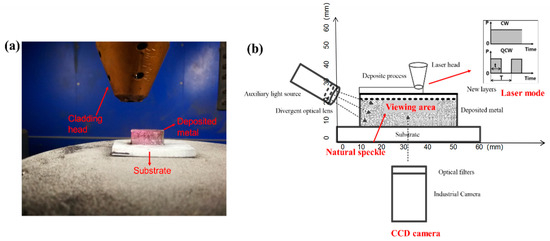 In this study, powder-feeding additive manufacturing was employed using a 316 L stainless steel substrate (60 mm × 60 mm × 10 mm) and 316 L stainless steel powder, as shown in Figure 1a. The tensile test specimen’s dimensions are illustrated in Figure 1b, and Table 1 provides material details. To monitor temperature variations, a BM_IR thermal imager was utilized, while instantaneous strain was observed with an industrial camera equipped with optical filters, enabling clear visualization of the deposition area (as shown in Figure 2) by filtering out extraneous light. The camera, with a resolution of 640 × 480 pixels, captured images at 225 milliseconds exposure and 40 fps, with strain field data analyzed using VIC-2D software. The VIC-2D system is a fully integrated solution that utilizes optimized correlation algorithms to provide non-contact, full-field, two-dimensional displacement and strain data for mechanical testing on planar specimens. In-plane displacements are measured at every point within the area of interest, and the full-field strain field is computed and displayed to easily identify strain concentrations. For the experiment, two single-wall DED-LB samples (25 mm length, 15 mm height) were fabricated on the substrate, and high-temperature black-and-white speckles were applied for transient full-field strain observation. The VIC-2D software was used to compute strain distribution. Additionally, the contour method, effective for mapping residual stress, was employed to determine residual stresses in the DED-LB sample. This method provides two-dimensional residual stress maps based on elastic superposition theory, where residual stress is relaxed by cutting and surface displacement (measured by a Coordinate Measuring Machine) is compared to a planar contour. The process involves cutting, surface measurement, and stress calculation, with detailed methodology available in references [18,19,20].