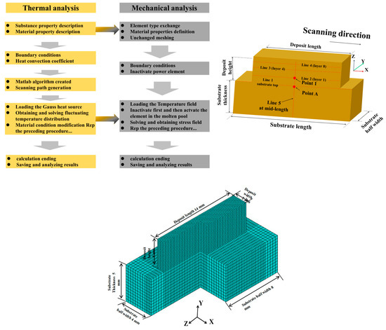 The finite element method (FEM) was used to simulate the development of the residual stress field during directed energy deposition (DED-LB) in austenitic stainless steels. Figure 3 illustrates the simulation methodology and the dimensions of the model [21]. The basic formula for transient heat conduction in the DED-LB process is listed in Equation (1):