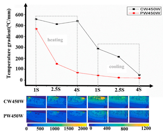 Figure 4 presents 2-D maps of the temperature distribution and X-direction temperature gradient at Point 1 under different laser modes during single-layer laser deposition. The X-direction temperature gradient data were extracted from the temperature distribution, following the method outlined in [22]. As the laser arrives, the metal heats up, and the temperature gradient sharply increases. The temperature gradient reaches its maximum when the laser is directly over the area: 558.47 °C/mm for CW mode and 465.75 °C/mm for PW mode. As the laser moves away, the metal begins to cool, and the temperature gradient gradually decreases until it approaches 0 °C/mm.