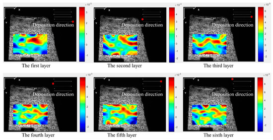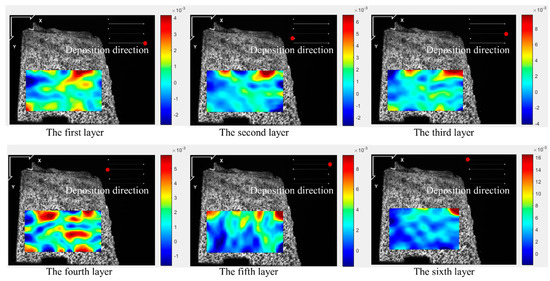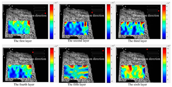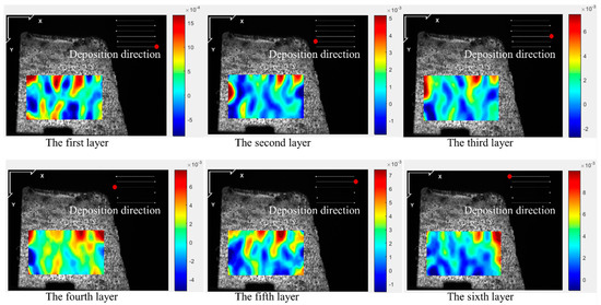 Figure 5, Figure 6, Figure 7 and Figure 8 illustrate the 2-D maps showing the evolution of longitudinal and vertical strain fields below the deposition layer during the six-layer deposition process for both CW and PW modes. The maximum strain areas (highlighted in red) appear above the visible strain cloud, with tensile and compressive strains (represented in purple and blue) distributed at the bottom to balance the overall strain state across the free surface. In the Y direction, a “tension-compression-tension” strain pattern is observed, whereas in the X direction, the strain distribution is irregular.