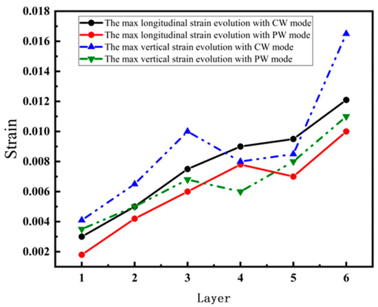 The maximum longitudinal and vertical tensile strain value of each layer with both laser modes are extracted from Figure 5, Figure 6, Figure 7 and Figure 8, as shown in Figure 9. The strain increases by heat accumulation as the deposition layers grow. For CW mode, the maximum longitudinal and vertical strains increase from 2.9 × 10−3 and 4.0 × 10−3 in the first layer deposition to 1.2 × 10−2 and 1.7 × 10−2 in the sixth layer deposition, respectively. Meanwhile, the strain is relatively smaller for PW mode; the maximum longitudinal and vertical strains are 1.5 × 10−3 and 3.0 × 10−3 for the first layer, and correspondingly, 1.0 × 10−2 and 1.1 × 10−2 for the sixth layer. It can be seen that under the same laser power, compared with the CW laser mode, the highest transient longitudinal strain of the PW laser mode is reduced by 16.7%, and the highest transient vertical strain is reduced by 35.2%.