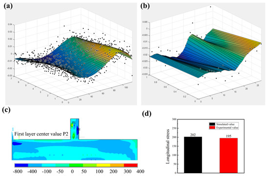 (a,b) The displacement measured in the encrypted and non-encrypted areas, respectively, caused by residual stress release; (c) 2-D mapping of the longitudinal residual stress () in deposited sample; (d) Comparison of simulated values and experimental values at point P1.