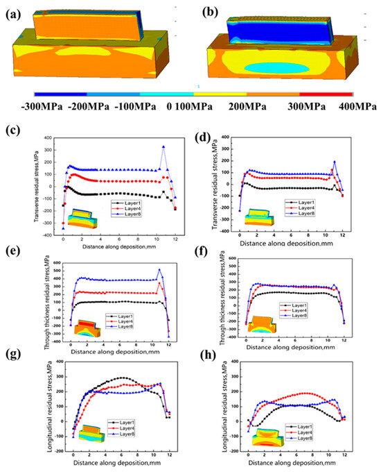From the maps in Figure 11c,d, the transverse residual stress data along the deposition direction can be extracted at the midline of the cross section. The results indicate that switching the laser mode at the same power led to an approximate 40% reduction in maximum residual tensile stress, decreasing from 350 MPa to 210 MPa. Similarly, the thickness residual stress data along the deposition direction can be obtained from Figure 11e,f, also at the midline of the cross section. The thickness residual stress distribution along the deposition direction shows that changing the laser mode, while keeping the same power, resulted in a roughly 45% decrease in maximum residual tensile stress, from 550 MPa to 300 MPa. Figure 11g,h provide longitudinal residual stress data along the deposition direction, extracted along the midline of the cross section. These figures illustrate that altering the laser mode, with power unchanged, reduced the maximum residual tensile stress by approximately 32%, from 300 MPa to 202 MPa.