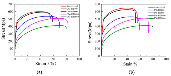 Tensile properties observed with CW and PW at different temperatures. (a) Mechanical properties of the samples after heat treatments under CW mode. (b) Mechanical properties of the samples after heat treatments under PW mode.