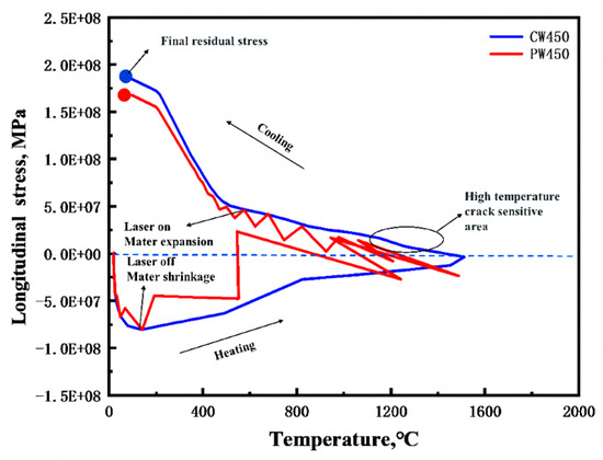 The relationship between temperature and stress was analyzed to further explore the mechanical deformation of stress components. Consequently, the temperature–stress relationship in both CW and PW modes was simulated using the commercial finite element software ANSYS 18.0. The results for Point A are schematically illustrated in Figure 13. During the heating process, the cladding metal experiences compressive stress within a specific temperature range. At the peak temperature of 1550 °C, the cladding metal stress reaches 0 MPa. Tensile stress begins to appear when the temperature reaches 1250 °C.