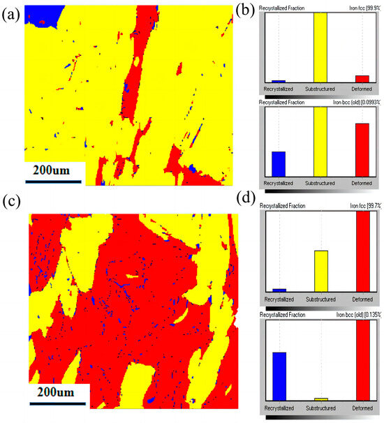 Recrystallization and phase diagram in CW mode and PW mode, (a) Recrystallization cloud image for CW mode, (b) Recrystallization fraction for CW mode, (c) Recrystallization cloud image for PW mode, (d) Recrystallization fraction for PW mode.